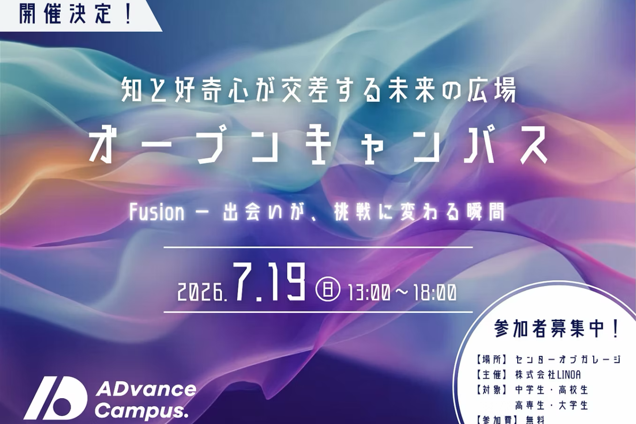 LINOAは、「知の結晶化」を通じて未来を創造するコミュニティ「ADvance Campus」を運営しています。ADvance Campusの企画として「知と好奇心が交差する未来の広場 オープンキャンパス2026」を開催するものです。